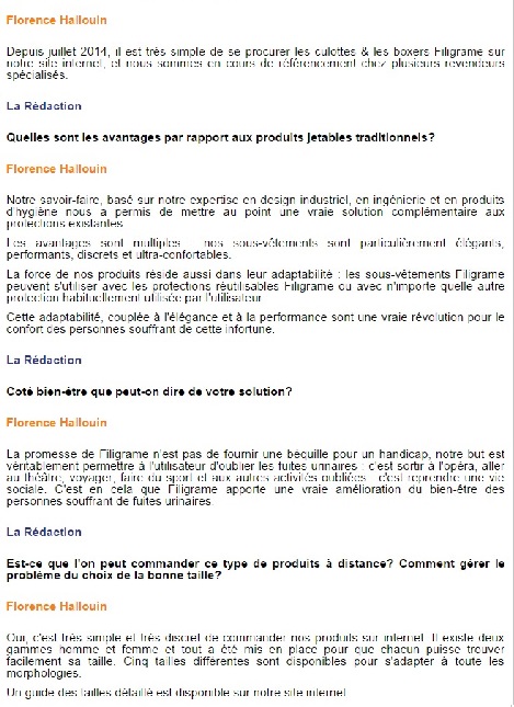 Florence Hallouin : La promesse de Filigrame n'est pas de fournir une béquille pour un handicap, notre but est véritablement permettre à l'utilisateur d'oublier les fuites urinaires : c'est sortir à l'opéra, aller au théâtre, voyager, faire du sport et aux autres activités oubliées : c'est reprendre une vie sociale. C'est en cela que Filigrame apporte une vraie amélioration du bien-être des personnes souffrant de fuites urinaires.